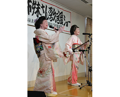 また、姉の栄子さんが、川中美幸さんの代表曲「二輪草」の曲に合わせて踊りも披露。三味線コーナーでは、三味線の生演奏で「お吉物語」「岸壁の母」を歌いましたが、特に「岸壁の母」を哀愁を込めて、子を思う母の気持ちを切々と歌う姿に、多くのお年寄りが感激して涙ぐんでいました。