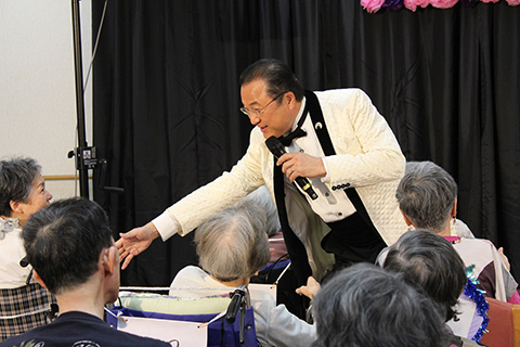 7月10日、稲城市の特別養護老人ホーム「いなぎ苑」に、佳山明生さんをお連れして歌謡ショーを行いました。併設のデイサービスの方々が開演の1時間も前から前列の席を埋め尽くし、佳山さんのショーを心待ちにされていました。会場のBGMとして流れる佳山さんの歌うカバーソングに合わせて、開演が待ちきれない方々の口ずさむ歌が廊下まで聞こえてきます。その後も続々と利用者が集まり、開演の時間には会場は溢れんばかりの150人の大盛況となりました。