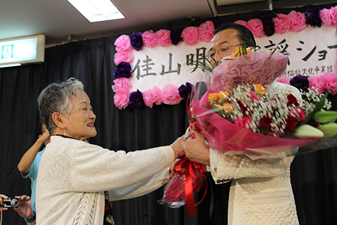 89才の入居女性から花束贈呈、皆さんとの記念写真を撮影し終演。会場を出ようとする原田さんに握手を求める沢山の人にも笑顔で、気軽に応じていました。