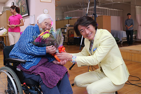 最後の花束贈呈は、なんと施設最高齢の107歳のおばあ様。ご自分でお食事も召し上がり、好物は硬いせんべいだそうで、佳山さんは年齢にも驚いていましたが、何よりお元気に受け答えされる事に驚嘆されていました。皆さんの温かい拍手と声援に見送られ、名残惜しい歌謡ショーも終演となりました。