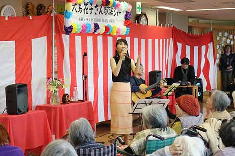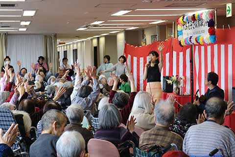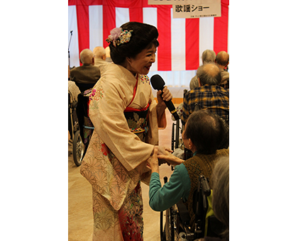 空いっぱいに青空が広がる小平市の特別養護老人ホーム「小平健成苑」に1月17日、大島花子さんをお迎えして歌謡ショーを開催しました。新年らしい紅白幕が張られた会場には、特養、デイサービス、近隣の認知症専門のグループホームから130人が参加し、全12曲を楽しみました。