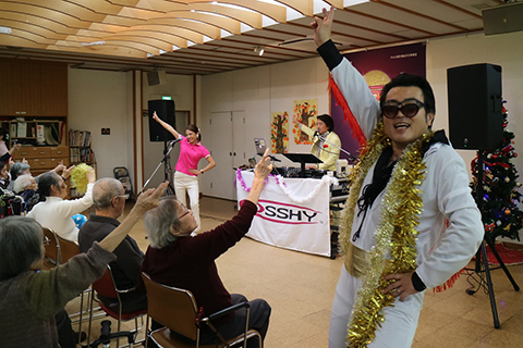 さんを高齢者施設にお連れして、懐かしのディスコミュージックなどに合わせて身体を動かして楽しいひと時を過ごしてもらう新イベント「DJ OSSHY