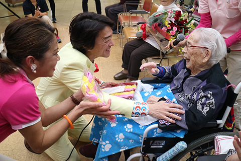 最後に105才の車いすの女性がにこやかにオッシーに「ありがとう」とお礼の言葉を伝え、ご自身が手編みしたバッグをプレゼント!しかも最近短時間で編まれたそうで、またビックリ!!100才の女性から花束を贈られ、そのお元気な姿に「人生は120年時代。いやそれ以上」とオッシーは感動していました。温かく迎えてくださった施設の方々、参加者全員に感謝いたします。