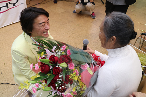 最後に最高齢の104才の女性から黄色い可愛らしい花束を贈られ、オッシーさんも最高の笑顔!!少し涼しく感じる梅雨の日でしたが、会場は熱気ムンムン、いつしか窓を全開するほど活気あふれる素敵な一日となりました。