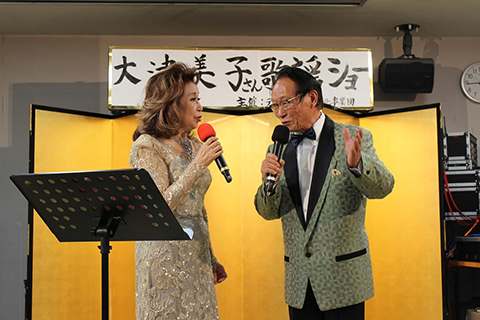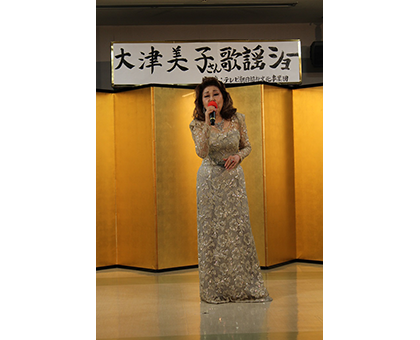 司会者の早川さんが、大津美子さんを紹介。ロングドレス姿の大津美子さんが、「リンゴの唄」を歌いながら登場。大きな拍手とともに歌謡ショーがスタートしました。大津さんが1955年に紅白歌合戦に初出演した時に歌った「東京アンナ」から、昨年の傘寿記念で発表した新曲「北斗星(ほし)に祈りを」など、全8曲を熱唱しました。