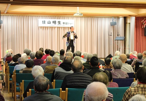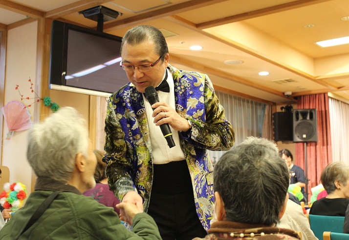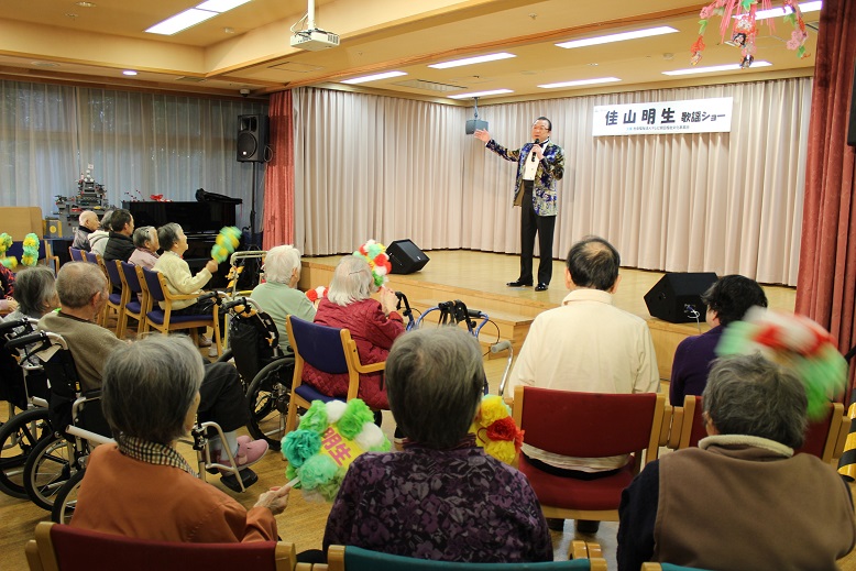 1月10日、八王子市の養護老人ホーム「竹の里」・特別養護老人ホーム「桜の里」に、佳山明生さんをお連れして新春歌謡ショーを行いました。当日は、暖冬の影響で比較的に暖かい好日となり、雲一つない晴天となりました。新年を迎えて、佳山明生さんの歌謡ショーを楽しみにしていた入居者の方たちなど、約110人が会場となった「多目的ホール」に集まり、佳山さんは昭和を代表する歌謡曲を中心にアンコールを含め全6曲をカラオケで熱唱しました。