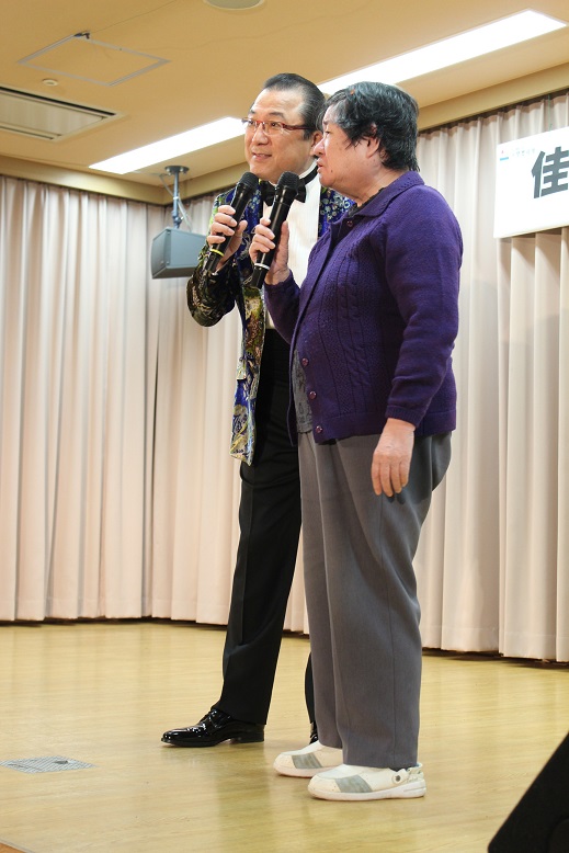 そして、いよいよ生演奏で「津軽あいや節」も披露。歌謡曲のコーナーではカラオケで 三橋美智也さんの「達者でナ」を歌った後、デュエット曲、「ある夫婦のうた」をお囃子の堀さんと二人で笑顔でデュエットすると、会場もお年寄りの笑顔で溢れました。また、東日本大震災復興支援ソング「花は咲く」を、会場の皆さんと一緒に歌いあげました。