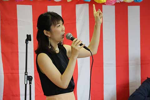 司会者の早川さんの紹介で、原田さんが登場すると、大きな拍手でショーが始まりました。三味線、尺八、鳴り物、お囃子の生演奏で、「新相馬節」(福島県)から、「斉太郎節」(宮城県)を熱唱。会場は大きな手拍子で大変盛りあがりました。参加者の中には、原田さんの唄に合わせて口ずさむ方も多数いました。福島県浪江町出身の原田さんは、東日本大震災で被災した故郷への思いから、これからも引き続き支援していく必要性を訴えていました。
