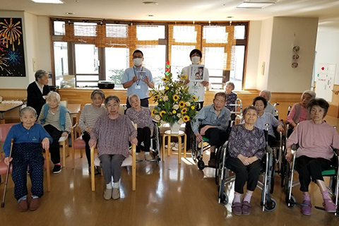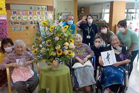 素敵なお花をお届けいただいてから1カ月が過ぎようとしています。コロナ禍の感染予防対策実施中の単調な生活の中で花音様のお花のアレンジは、一際あかるく圧倒的な存在感で、ご利用者様の心を明るくしていただきました。