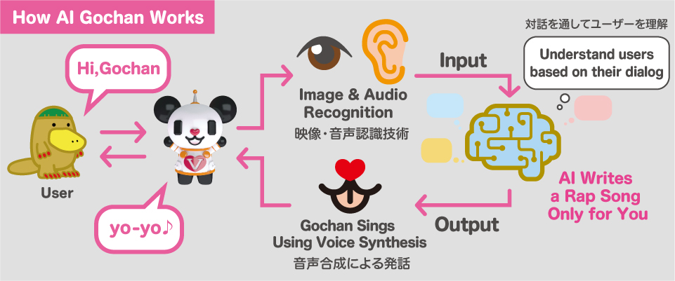 日本で数々のイベントに登場した「AIゴーちゃん。」が人工知能を駆使して、即興で体験者だけのオリジナルラップソングを歌います。