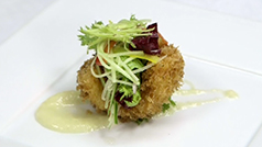 片岡護シェフ「鱧フライのわさびソース きゅうりのサラダ添え」