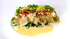 片岡護シェフ「鯛の蕎麦蒸し 白バターソースとトマトソースとわさび添え」