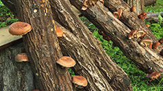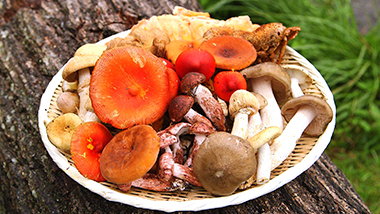 神宮司さんの経営するロッジを訪ねると、そこにも色とりどりの きのこがずらり。椎茸の原木栽培をはじめ、自然に近い形で育てているきのこまで。貴重な天然きのこを炭焼きにして食べる。