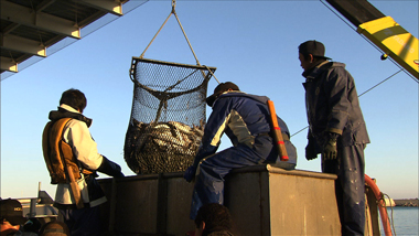 肌寒い早朝、港で鮭の水揚げを見て、漁師たちの勇ましい姿に圧倒される2人。
