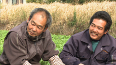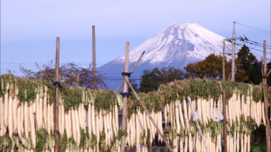2人は、漬物用の大根を干している本間さんに出会い、お手伝い。実は、古くからこの地はたくあん作りで有名で、本間さんによると、漬物用の大根と通常の料理に使用する青首大根は品種が違うという。