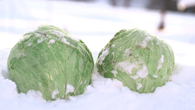 雪が積もると、キャベツは凍らないようにと根から養分を吸い上げ、糖分を増して甘くなります。