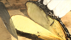 2人が訪ねたのは、タケノコ栽培の匠・山本剛(やまもと・ごう)さんの竹林。古田シェフと渡辺さんは鍬を持って、タケノコ掘りに挑戦。掘りたてのタケノコをその場でかじってみると…2人とも「甘い!」とビックリ。まるでフルーツの果汁のような、甘くてみずみずしい汁がタケノコからあふれ出てくるのに驚く。