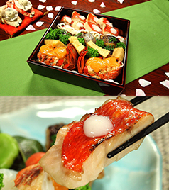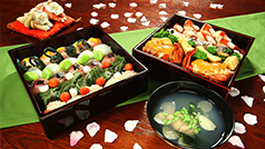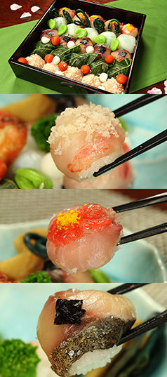 そして、いよいよ大江シェフが腕を振るう番! 稲取の金目鯛を食べてインスピレーションが閃いたという大江シェフは伝統のお祭り“雛のつるし飾りまつり”にちなんで“ひな祭り”をテーマに、金目鯛をはじめとする伊豆の海の幸を美しい手まり寿司に仕上げる。続いて金目鯛、黒ムツ、伊勢海老など豪華な焼き物を作り、2段の重箱に春らしく盛り付けた。