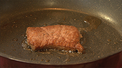 (2)フライパンを熱し、サラダ油をひく。塩・こしょうした肉を入れ強火で表面を焼き、肉汁を閉じ込める。
