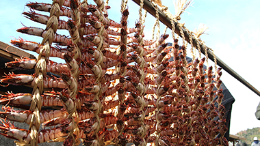 八代海で採れる極上のエビを使って作られる“吊し焼きエビ”は、薩摩藩主島津家の正月料理として使われた、最高級のだし用のエビ。現在でも、晴れの日の料理に使われているという。