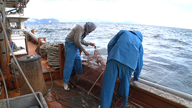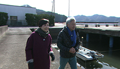 八代海でとれる極上のエビを求めて2人が訪れたのは、芦北町の佐敷港。エビ漁の“匠”、石村石末さん(78歳)は妻の順子さん(74歳)、息子の重隆さんと共に伝統の“うたせ漁”でクマエビをとっている。