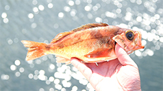 ウスメバルは沖合の岩礁に生息するので沖メバルとも言われ、オレンジ色の魚体が特徴です。