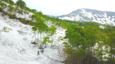 2人は、早朝からはじまる今野さんの山菜採りに同行。実は、月山の冬季の積雪量は10メートル以上。5月になると雪解けがはじまり、その標高によって季節が変化するという。標高600メートル付近では、関東で5月までが旬の山うどがこれから旬を迎え、標高700メートル地点では2〜3月が旬といわれるフキノトウを採ることができるという。