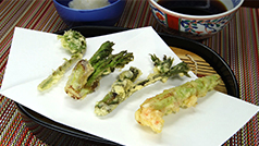 新井さんは、月山で採れた山菜はアクが少ないので、山菜のそのままの味を楽しんでもらおうと、山菜を刻んで、かき揚げにしました。