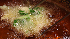 衣で包み込んでいるので、アクは抜けても香りは残るので、山菜の風味を最大限にいかすことができるんです。 - 御座敷天ぷらならではのきれいにあげるコツ