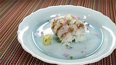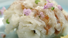 骨切りした切れ目に、すり込むように梅肉をのせ、葛粉をつけて、湯にくぐらせること40秒。