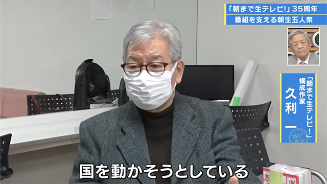 「朝まで生テレビ!」には放送開始から現在まで、番組に携わる五人衆がいます。司会の田原さん、番組進行の渡辺キャスター、プロデューサーの吉成さん、構成作家の久利さん、タイムキーパーの山内さんの5人です。