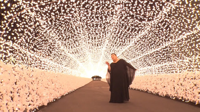 イルミネーション開催中の大井競馬場を徘徊していると、今回の目玉である “江戸桜トンネル”を発見。煌びやかなピンクの光に包まれながら、記念撮影をするマツコ。
