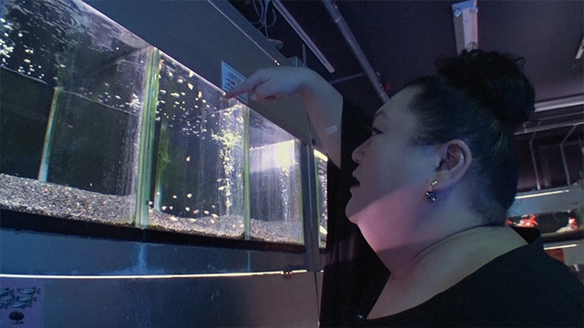 大型熱帯魚専門店を徘徊中、メダカの水槽を発見。メダカを飼っているお客さんに話を伺いながら、可愛らしいメダカの購入を検討する。