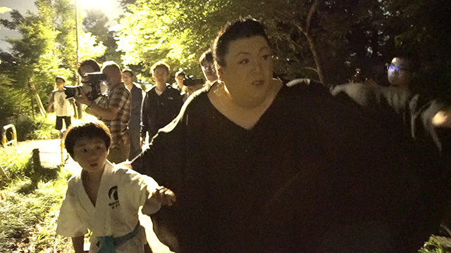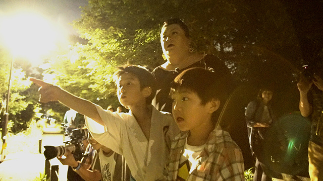 暗闇の中、ほの明るい光が舞う。いつの間にか周りの子どもたちも巻き込んで、一緒にホタルの光を追いかけるマツコ。