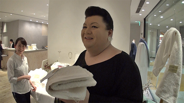 専門店が並ぶ4階のショップフロアへ。バス用品店で、マツコは非常に柔らかくて軽いタオルに驚き、プレゼント用にまとめ買いすることに...。