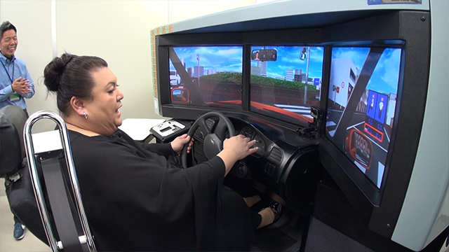 実際に教習で使われるドライブシミュレーターを体験。シミュレーションといえども、人に危害を加えたくないというマツコは、慎重になりすぎて超ノロノロ運転に...。