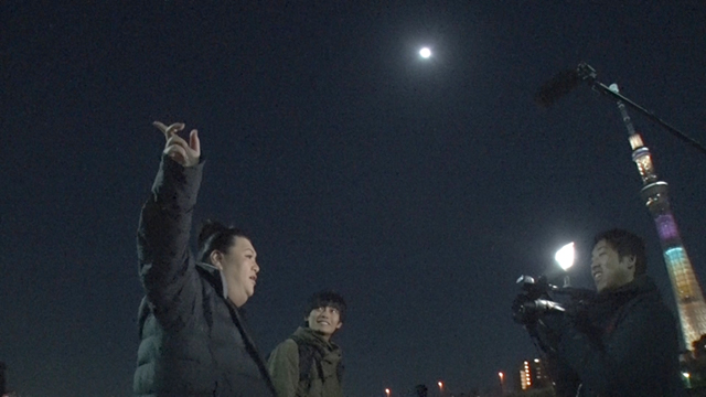 いよいよ月食開始の時間が迫る中、月とスカイツリーが一緒に見られる観測ポイントへ。寒空の下、徐々に欠けていく月の様子を見守っていると、あるカメラ好きの若者と遭遇…ロケは思わぬ展開に!