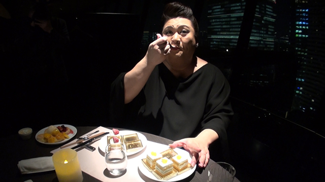 寿司や天ぷらなどを食べ終えたら、「勝負はこれからだ!」と意気込みながらスイーツコーナーへ。高級ショートケーキやパンケーキを1つ2秒のペースで頬張っていく…。