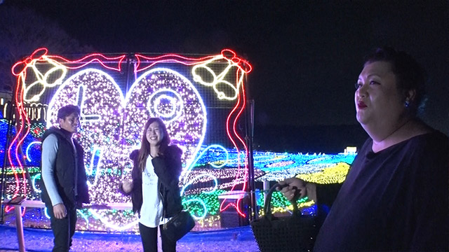 相性診断ができる「LOVE」と書かれた体験型イルミネーションを発見。遊びに来ているカップルに声をかけ、体験する2人の相性を見守るマツコ。