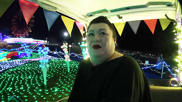 電動カートに乗って彩られた園内を回遊。敷地いっぱいに広がるイルミネーションを見ながら「これを作業するのは大変だわ…」と作業者の苦労をしみじみと感じるマツコ。