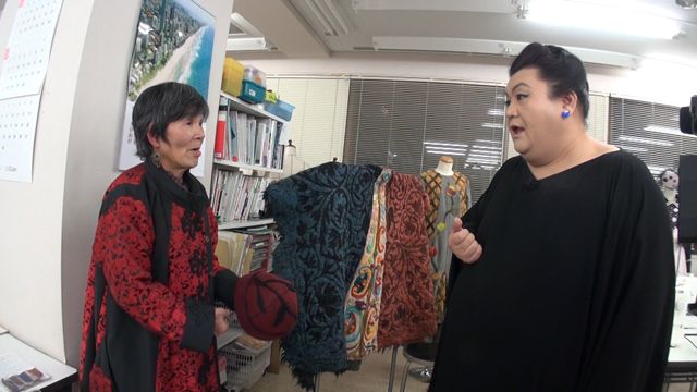 洋裁・和裁の講座が行われているフロアへ。教室に展示されている、生徒さんたちが作った個性的でクオリティの高い作品に興味津々のマツコ。