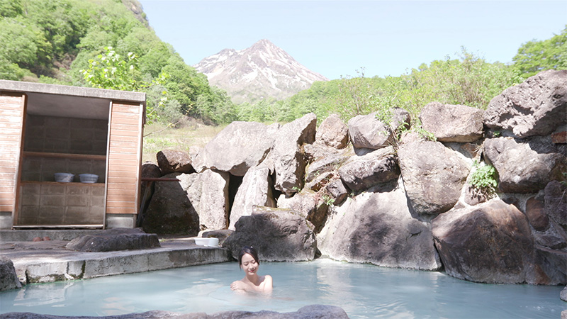 妙高山の登山口にある共同浴場「黄金の湯」は男女別・岩造りの露天風呂で誰でも無料で入ることができます。