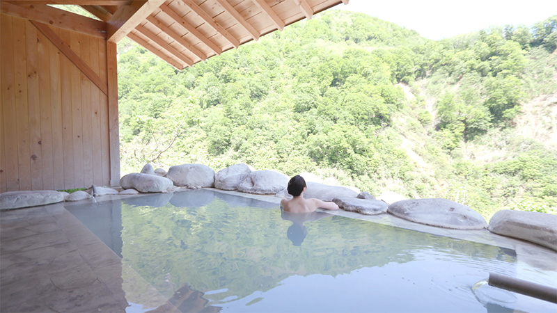 女性専用の露天風呂は新緑を見渡す、まさに絶景です。目の前の渓谷には、野生の動物が姿を見せることもあるそうです。