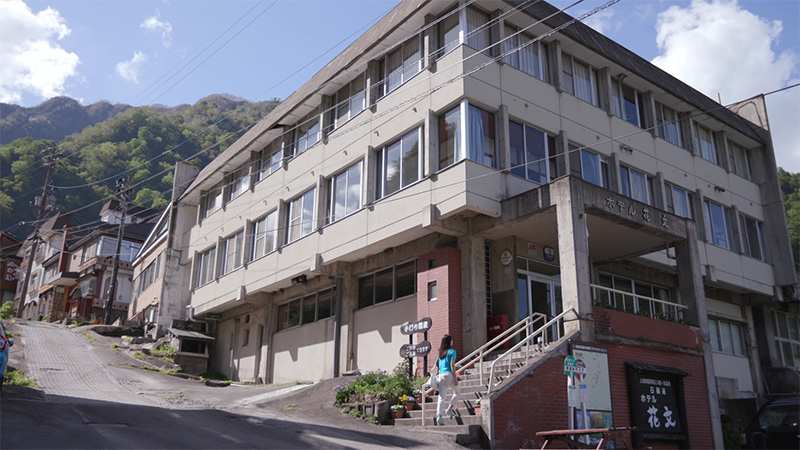 渓谷沿いにロッジ風の宿が並び、その中でも老舗の宿「花文」は創業100年を超えます。