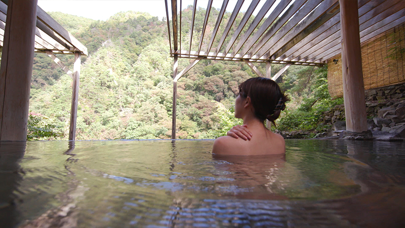 大川荘には6つのお風呂があり中でも圧巻なのが、「たな田」と名付けられた露天風呂です。渓谷に向かって、3段に配置された湯船。各段の湯船の高さが1メートルほどあり、お湯に浸かると下の湯船が見えなくなるので、渓谷の絶景が目の前に迫ってきます。