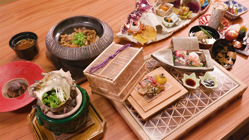 夕食は、食材だけでなく、器にもこだわった「元湯・陣屋」ならではの会席料理が味わえます。