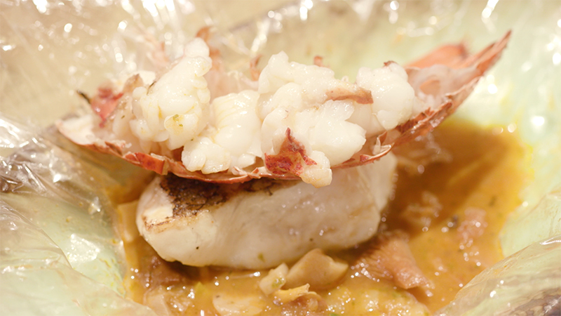 夕食を旅館に併設された「迎賓館」でいただくプランでは、真鯛とオマール海老のソテーや、松阪牛のステーキなど、豪華な鉄板焼きが味わえます。