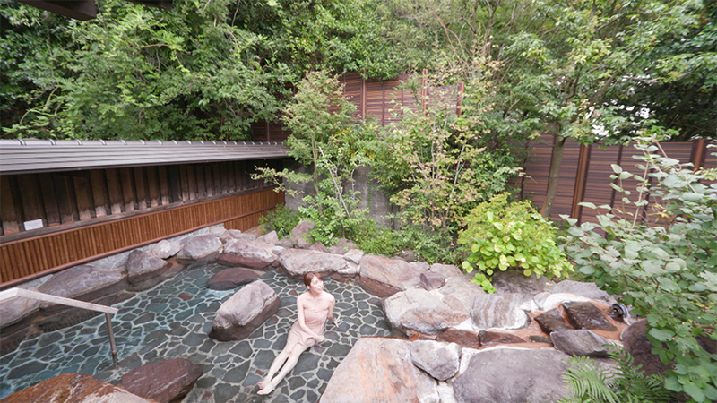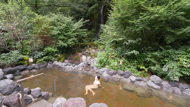 緑に囲まれた露天風呂「車沢の湯」は、奥に高さ約15mの滝が流れ落ちており、浸かればお湯と滝の音に癒されます。