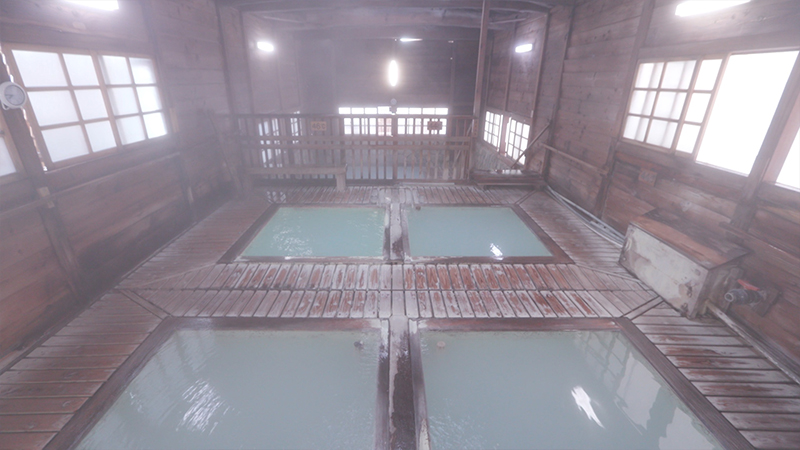 そんな「那須湯本温泉」の象徴とも言える場所が「鹿の湯」です。今でも療養の目的で訪れる人が多いという湯治の伝統が色濃く残る共同浴場です。浴室には、温度の異なる湯船が5つ。酸性の強い、白濁の硫黄泉がかけ流されています。