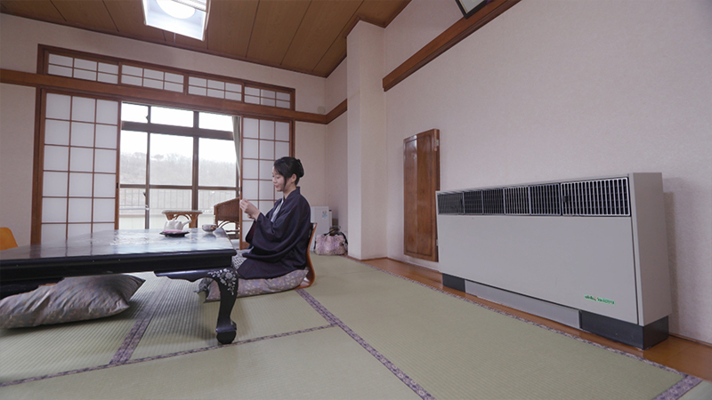 宿では、水を通した配管を温泉で温めて、各客室の暖房に利用しています。